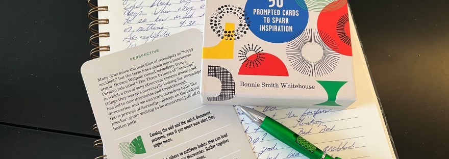 My wife bought me this deck of Kickstart Creativity cards for my birthday. The Serendipity card was nestled within the Perspective section of the deck and, needing to find some this morning, I blindly pulled it out. Bonnie Smith Whitehouse’s words read:
